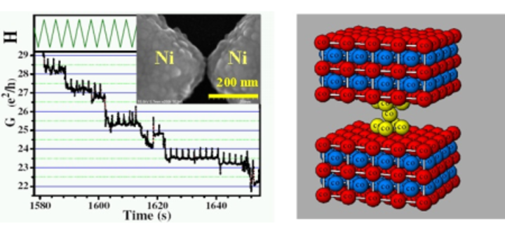 Magnetic nanocontacts have shown interesting and large magnetoresistance effects that might have potential in high-sensitivity sensors. We have prepared Co and Ni magnetic nanocontacts with focused-ion-beam and electrodeposition methods. The figure below shows the junction and the graph shows quantum conductance steps, indicating a Ni junction of dimensions less than 1 nanometer. The nanocontact has been modeled with a structure shown at the right. The electronic structure and conductance was calculated and the result showed that atomic size contacts can produce fully spin polarized currents as well as act as a valve that can be switched between conducting and non-conducting states. Further research may lead to significant applications.